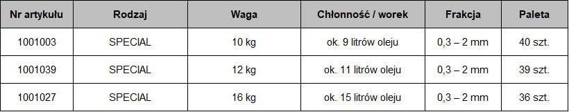 - Ekstremalnie silne zdolności absorpcyjne: 1 kg sorbentu jest w stanie pochłonąć ≥ 1,15 litra